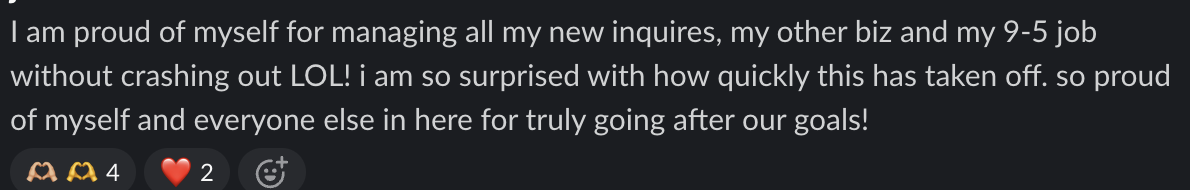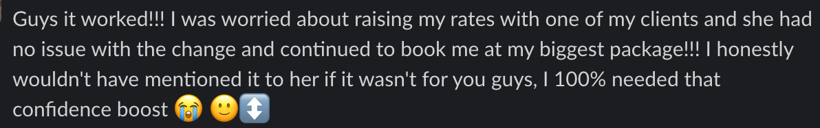 I was able to quit my 9-5, replace my corporate income and make MORE, grow my confidence within my work, meet new people, make amazing connections and it really opened my eyes to the possibilities and growth that I can see in myself and my business. It was entirely worth the investment and the best thing I have ever done!
